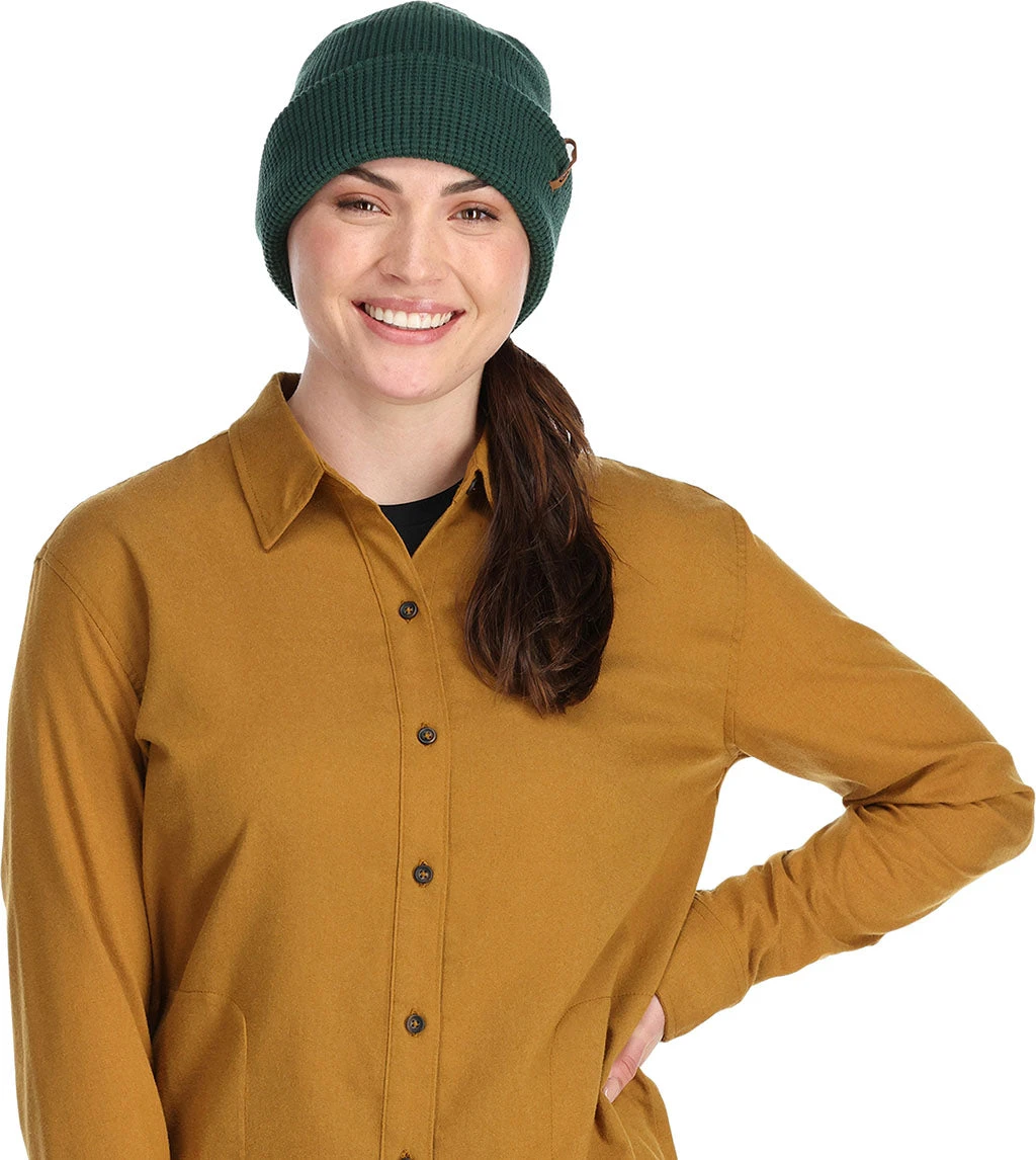 Reduce, Reuse, and then Recycle into a warm and soft yarn. This cuffed waffle knit is ready for your next adventure.